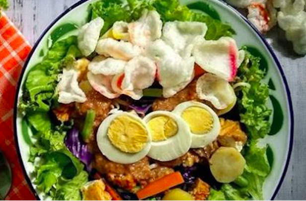There are many versions of Indonesian vegetable salads. They are usually vegetarian, mostly vegan, and all have a mixture of veggies, salad, proteins and carbs, served with a peanut sauce. They are often served with Indonesian crackers on the side. The sauce can either be stirred through the vegetables or served on the side. In Indonesia, every restaurant or street food vendor serves their own versions, and they also vary regionally throughout Indonesia as they have been adapted to local tastes and available vegetables. Most are thought to have originated in the West Java/Banten (Sundanese) area around Jakarta.