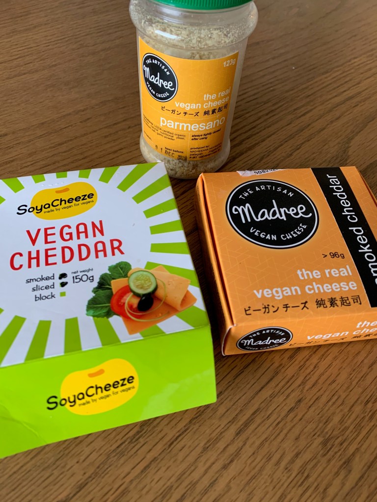 I was quite excited when Grand Lucky (our local supermarket) started stocking a few vegan cheeses. As a show of solidarity and to encourage more vegan products, I thought I’d pick up a couple and see what they were like. I bought a vegan parmesan, a vegan smoked cheddar and a vegan soy-cheddar.